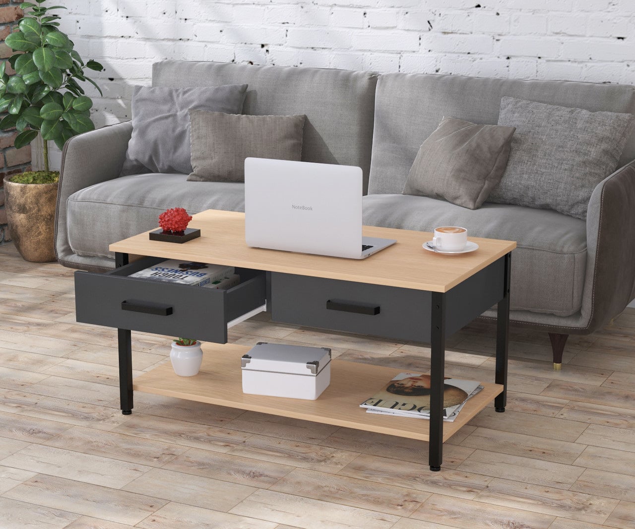 Журнальный столик L-6 выполнен в современном стиле - минимализм. А благодаря вставкам в цвете Антрацит, чёрным ручкам и металлическим ножкам он превосходно впишется в интерьер в стиле Лофт.