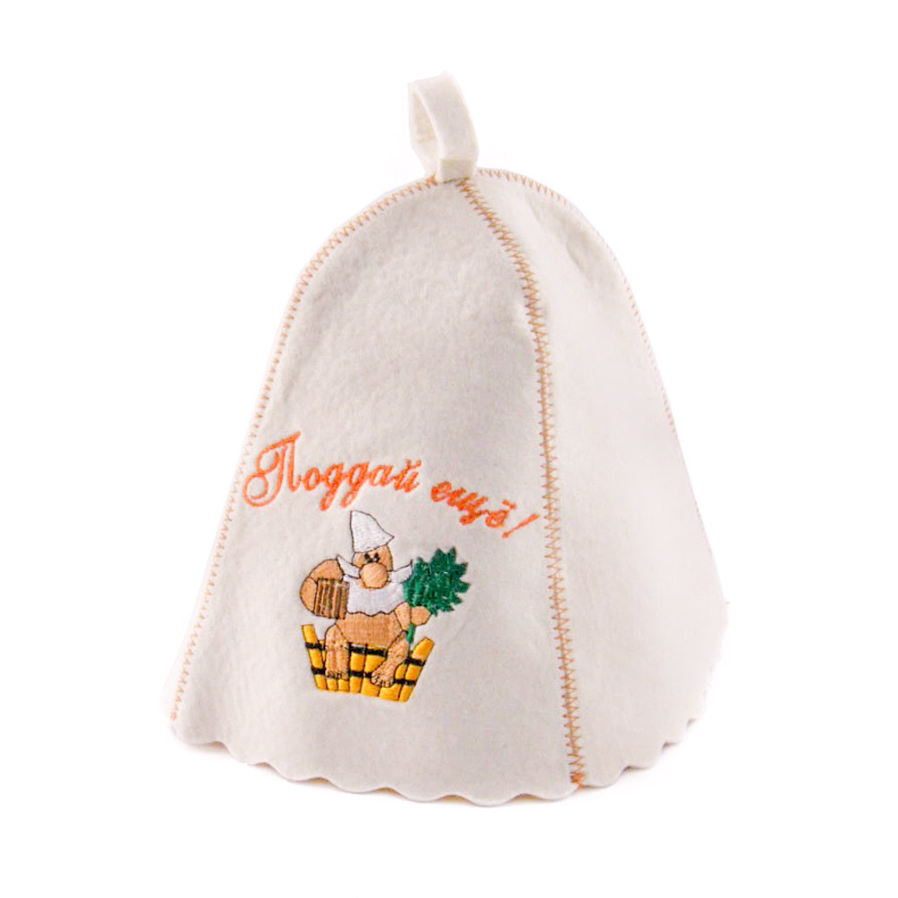 Банна шапка незамінний аксесуар при відвідуванні лазні та сауни. Окрім оригінального зовнішнього вигляду або веселого слогана вишитого на ній шапка виконує дуже важливу роль – вона береже голову від перегріву. Ми рекомендуємо підходити до вибору шапки для лазні та сауни не менш відповідально, ніж при виборі іншого головного убору. Банна шапка з вишивкою "Піддай ще" виготовлена ​​з натуральної повсті. Колір повсті білий. Модель має всередині петельку, яка дозволяє повісити шапку на гачок. Цей матеріал має стійкий колір, який не линяє та не вигоряє. Догляд за виробом: У пральній машинці вироби з фетру потрібно прати в режимі вовни, можна віджимати в делікатному режимі віджиму. Температура води не повинна перевищувати 40 градусів, особливо якщо кольорові вироби. Сушити потрібно виріб у розгорнутому вигляді.