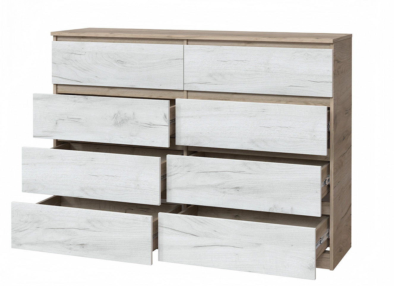 Комод Мастер Форм с 8 выдвижными ящиками телескопы Дуб крафт серый + Дуб крафт белый (130х37,6х95 см)