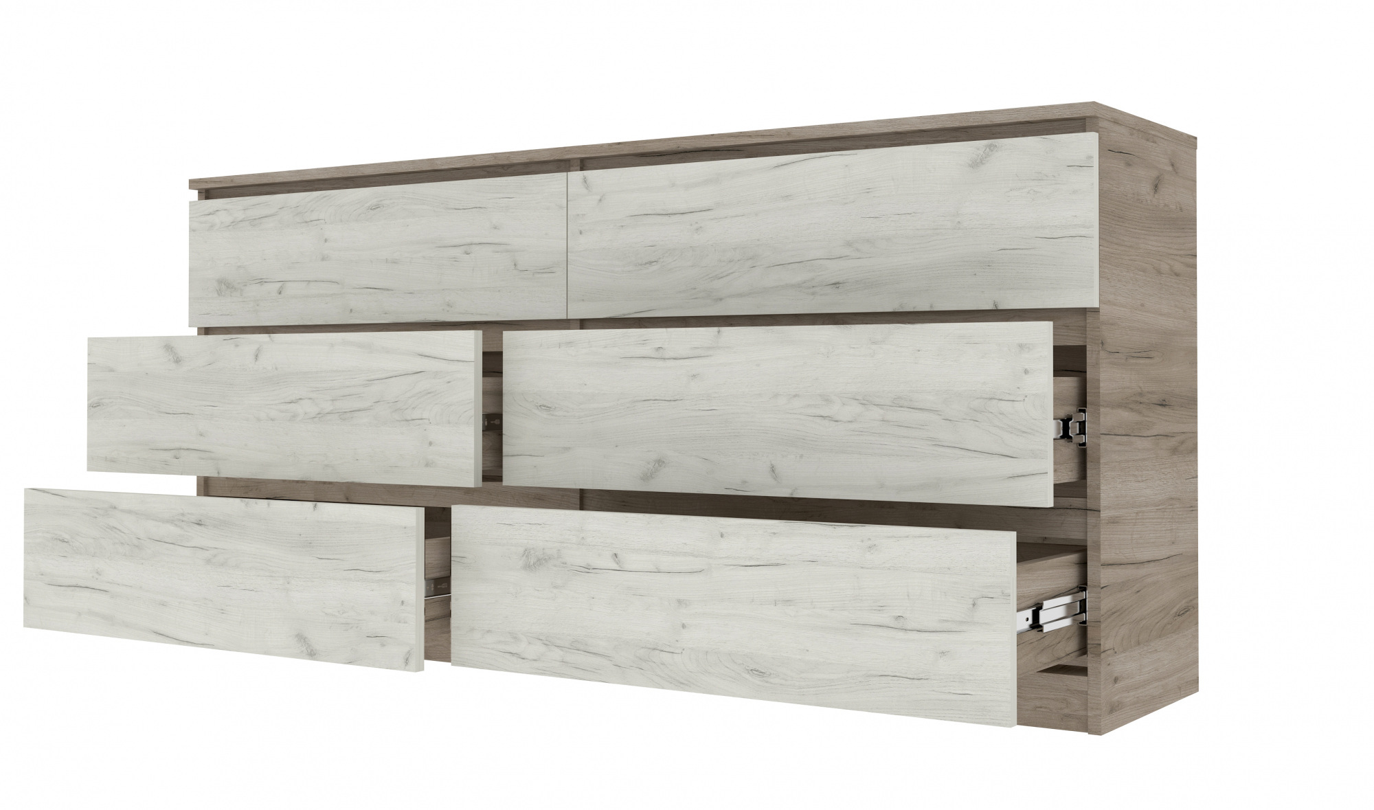 Характеристики товара Широкий комод Мастер Форм з 6 висувними шухлядами телескопи Дуб крафт сірий + Дуб крафт білий (150х37,6х73 см)