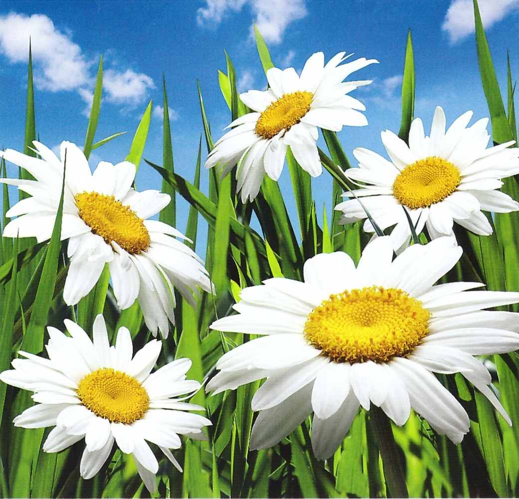 Великі ромашки дивляться у відкрите блакитне небо, простягаючи свої пелюстки назустріч промінцям грайливого сонця. Фотошпалери Престиж №14 204х196 додадуть інтер'єру приміщення яскравості, свіжості, затишку та зарядять гарним настроєм на цілий день. Модель виконана на щільному, якісному, водонепроникному папері українського виробництва. Яскраві, білі, свіжі ромашки дадуть постійне відчуття весни.