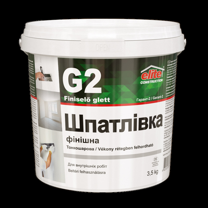 Фінішна акрилова Шпаклівка "Гарант-2/G2" застосовується для високоякісного тонкошарового фінішного вирівнювання стін та стель по різних мінеральних (штукатурка, пінобетон, бетон, цегла, гіпсокартон) та дерев'яних (фанера, ДСП, ДВП, OSB) основ. Має відмінне зчеплення з різними типами поверхонь. Міцна, еластична, добре шліфується, швидковисихаюча, екологічно безпечна. Фінішна Шпаклівка після висихання утворює білу та ідеально гладку поверхню придатну для подальшого оформлення. Властивості швидковисихаюча; відмінне зчеплення з різними типами поверхонь; еластична; міцна; добре шліфується; екологічно безпечний.