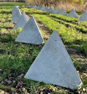 Бетонный тетраэдер , или противотанковая пирамида - Зуб дракона. Применение: "Зуби дракона" защита территорий от танковых атак. Марка бетона В 25 или В 30. Размер 1040х1040 мм, Объем 0,14 м3. Вес 0,35 т.. Автомобильная норма загрузки 60 шт.