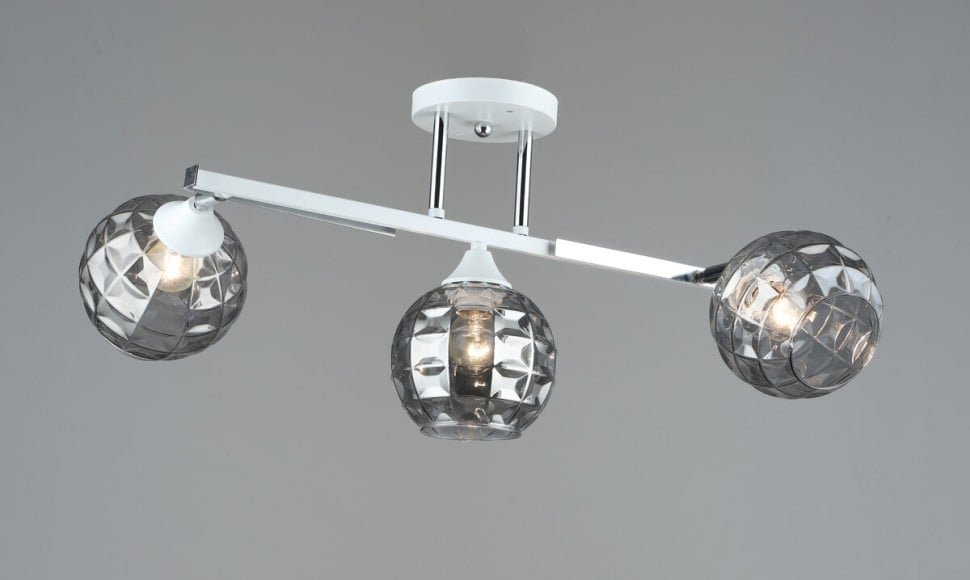 Каркас из металла белого и хромового цвета придает этому люстру легкость и стильную элегантность. Три плафона из стекла круглой формы в хромовом оттенке придают виду вашего пространства непревзойденную красоту. Однако настоящая жемчужина этой люстры – это ее поворотный механизм, позволяющий направлять свет туда, куда именно вам нужно.