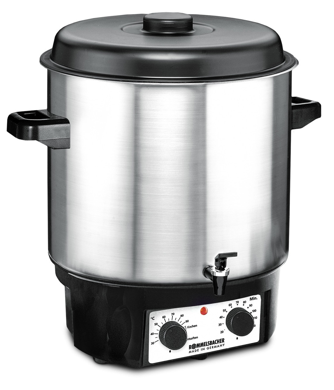Аппарат для гарячих напоїв/консервації Rommelsbacer KA 2004/E Глінтвейн-мейкер Rommelsbacer KA 2004/E Колір продукту: нержавіююча сталь/черний Матеріал корпусу: нержавіюча сталь Габаритні розміри: 46,00 х 41,50 х 49,00 см Міцність 1800 Вт Вага 5,21 кг Таймер 120-хвилини Вмістість 27 л або 14 банок по 1,0 л Особливості: вмонтований термостат для постійної температури - автоматична система приготування для автономного контролю процесу консервування Виробник: Країна виробництва: Німеччина Гарантія: 24 місія Професійне консервування фруктів, овочів тощо добре консервується Повністю автоматична плита для гарячого пунша / консервування з випускним краном Чудова винососта каструля з кислотосторідкою двошарової емалі та обома з нержавіючої сталі місткість: 27 л або 14 банок по 1 л кожна Безступне регулювання температури встановлення для віджиму соку (призначено EA 1803) вбудований термостат для постійної температури Автоматична система приготування для автономного керування процесом консервування 120-хвилинний таймер, параметри безперервної роботи затіснені ручки, з'єднана кришка Закрите дно каструлі для легкої очищення контрольна лампа, захист від перегріву, натягувач шнура У тому числі вставка ґратки Консервувати можна все! Ці консервові фрукти, овочі, соки та варення корисні і консервують. Взимку вони ідеально підходять для подачі гарячого глінтвейну або пунша. Установлена температура надійно підтримується термостатом, а в модлях з розливним краном можна зручно розливати прямо в чашки. Консервні плити Rommelsbacer також використовуються, щоб підтримувати тепло у великих кількостях продуктів на бенкетах та заходах. Ще одна перевага: разом з кришкою для віджиму соку (тип EA 1803), доступною як аксесуара, їх також можна використовувати як парові соковижалки.