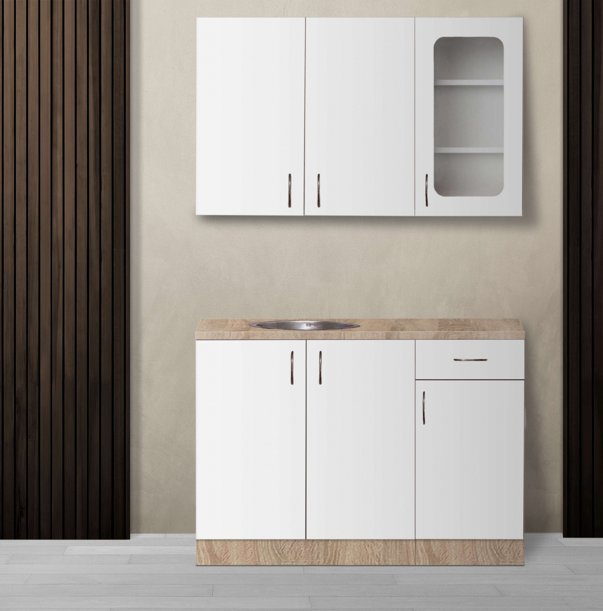 Навісний шафа-сушка (дводверна) 0,8 м; Навісна шафа-вітрина (однодверна) 0,4 м; Нижні секції: