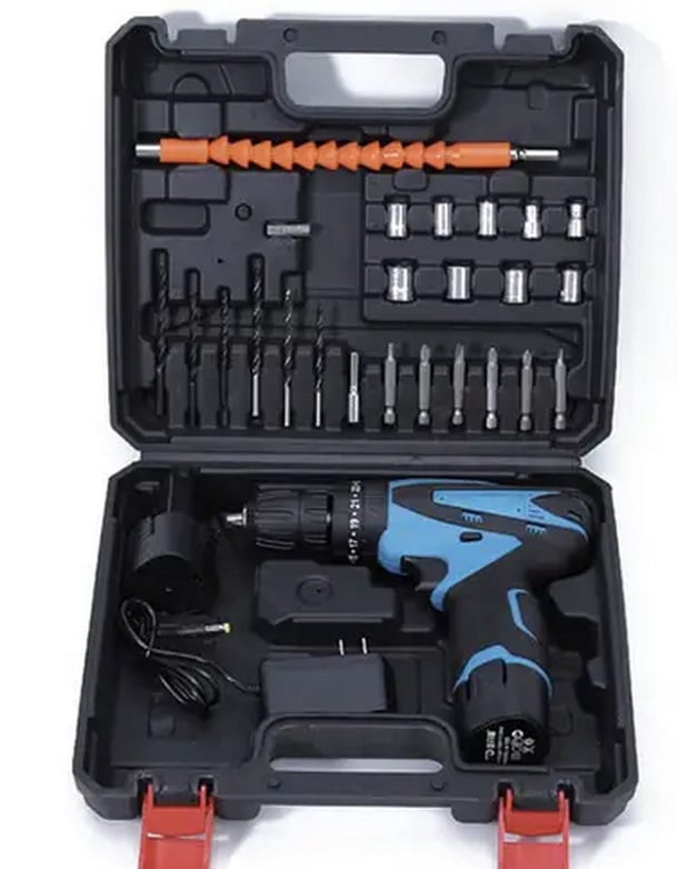 Шурупокрут у валізі з набором інструментів 12V 2 акумулятори Шурупокрути досить широко застосовуються під час проведення монтажних або будівельних робіт, а також для виконання побутових завдань різного типу. Головна перевага цього інструмента — виняткова мобільність, широкі функціональні можливості й універсальність застосування. Цей шурупокрут підійде для дому, для невеликих робіт, збирання меблів, закручування шурупів, свердління дерева, пластику. ТЕХНІЧНІ ХАРАКТЕРИСТИКИ: Живлення: Акумулятор Режим інструмента: Безударний Тип патрона: Швидкозатискний Максимальний діаметр патрона: 10.0 (мм) Максимальний крутний момент: 22.0 (H*m) Кількість обертів: 1 режим: 0-350 об/хв, 2 режим: 0-1300 об/хв Кількість ступенів затягування: 18 Ємність акумулятора: 1.5 (А/год) Напруга акумулятора: 12.0 (В) Час заряджання акумулятора: 1.0 (год) Вага: 1кг ОСОБЕННОСТИ: Літієвий акумулятор (12 вольтів, 1.5 А./год.) Плавне регулювання обертів 18 режимів тріскачки Режим свердління Підсвітка Гумові проставки на ручці Швидке заряджання акумуляторів (60 хвилин) Дві швидкості редуктора КОМПЛЕКТАЦИЯ: Зарядний пристрій Акумулятор — 2 шт. Картонне паковання Кейс