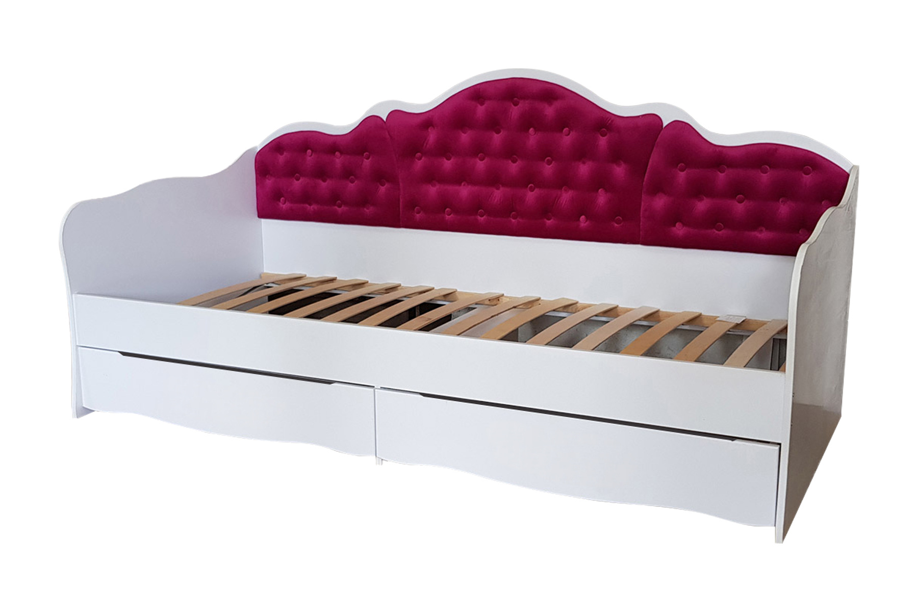 Ліжко має м'яку спинку з ґудзиками в колір оббивки або стразами, а також шухляди для зберігання різних речей. Ліжко може бути доповнене подушками в кольорі оббивки спинки.