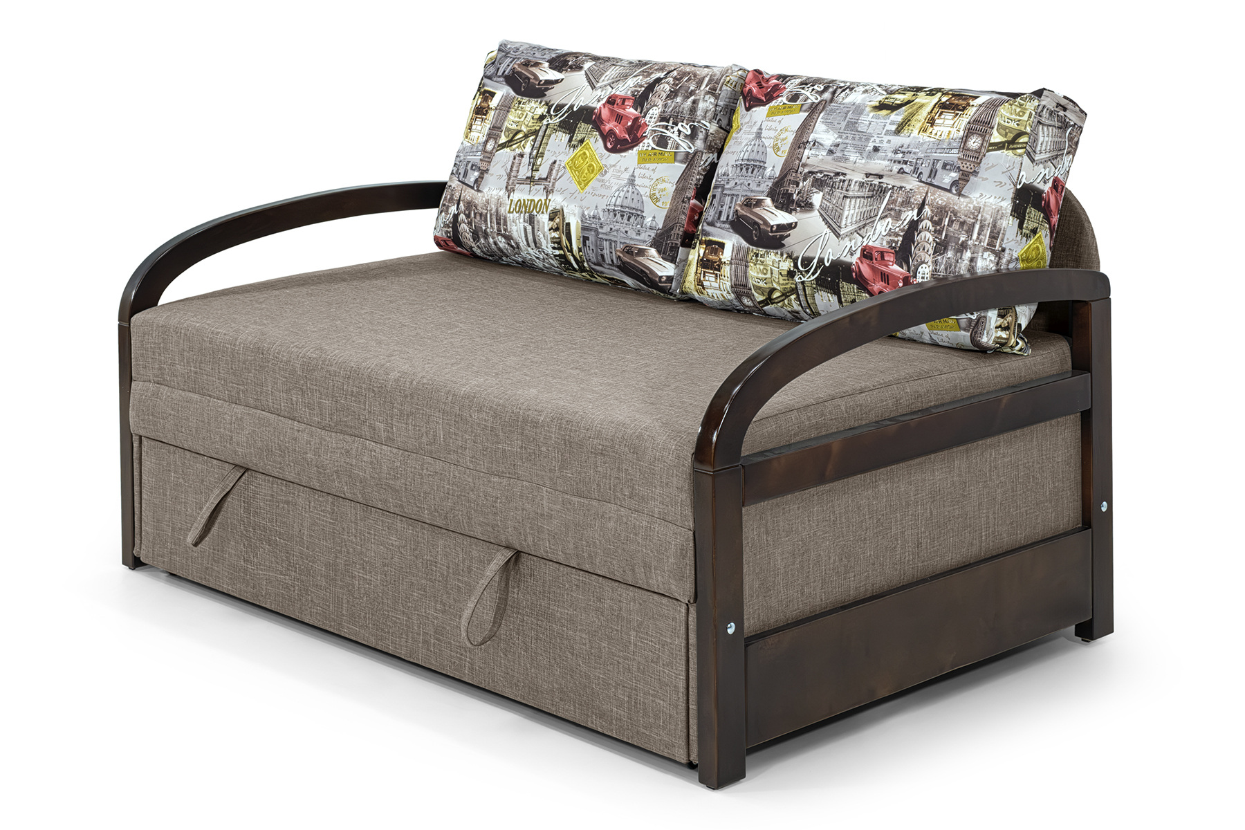 Компактний розкладний диван-крісло з дерев'яними підлокітниками.
