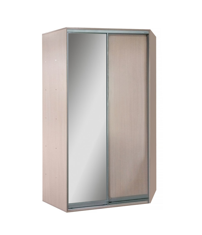 Шафа-купе Економ Кутова ШКЕУ МАКСІ-МЕБЛІ складається з розсувних дверей і полиць, при цьому одні двері виконані з ламінованого ДСП, а другі дзеркальні.