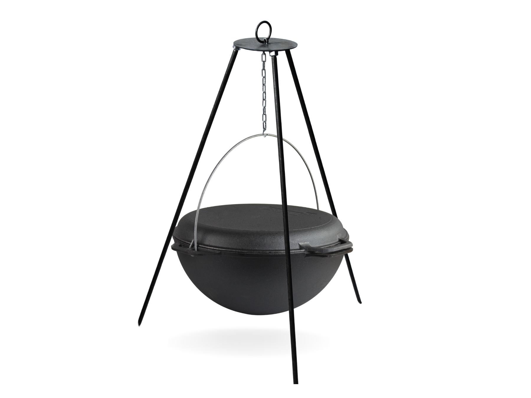 Азиатский чугунный казан емкостью 12 л, Укомплектован дужкой и чугунной крышкой гриль, Предназначен для приготовления блюд на костре или мангале, требующих тушения, томления и приготовления в собственном соку,