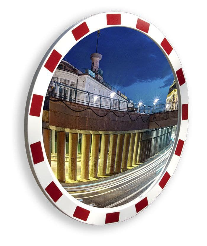 Сферическое дорожное зеркало со светоотражающей полосой на корпусе для обеспечения лучшей видимости. Дорожное зеркало безопасности Mega 600 производства ведущего европейского производителя Megaplast, Bulgaria. Используется для обеспечения безопасного движения на дорогах. Позволяет избежать происшествий на сложных участках дорог, выездах, закрытых перекрестках, парковках, гаражах, паркингах.