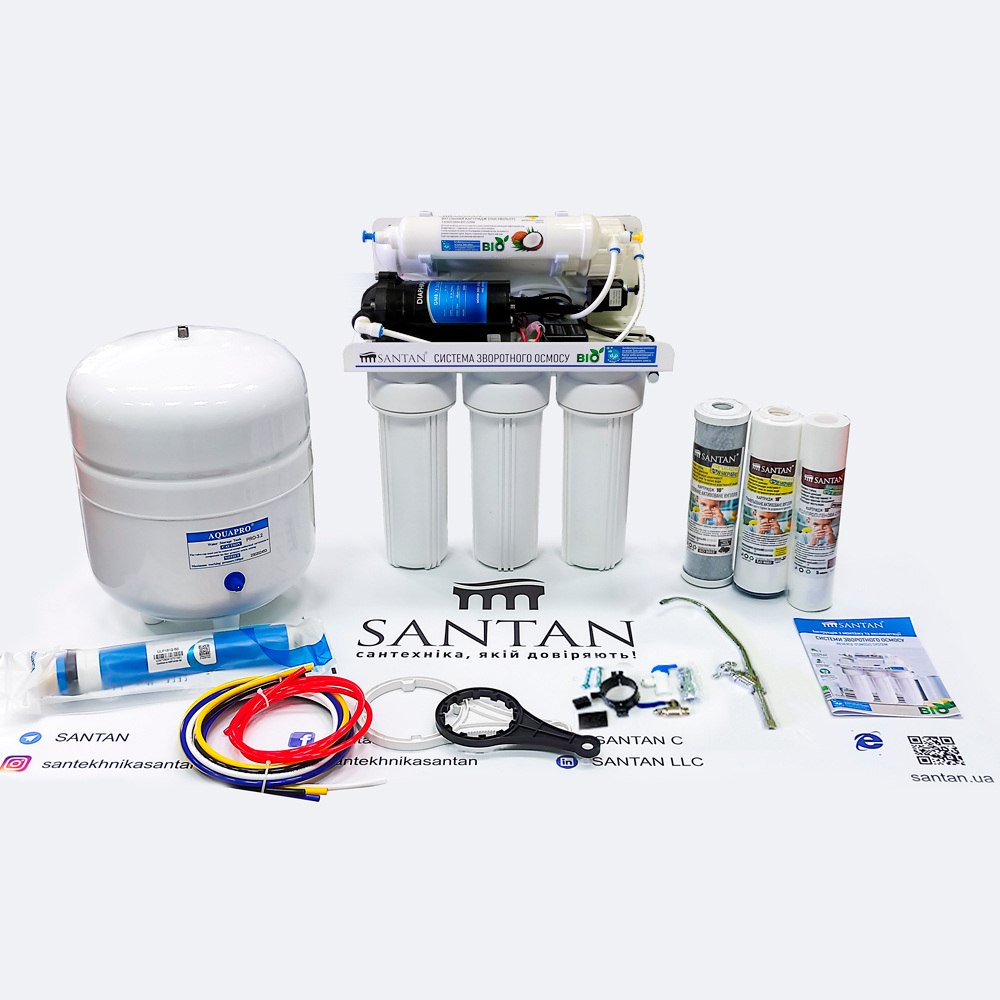 Фильтр обратного осмоса SANTAN 50G RO5P с помпой, состоящий из 5 последовательных ступеней очистки воды. Собирается в Украине. Предназначена для получения питьевой воды из муниципального водопровода или воды из скважины. Фильтр комплектуются мембраной, производительностью до 50 GPD (180 литров/сутки); Картридж из вспененного полипропилена -FCPP 10" 5 мкм - очищает воду от механических примесей размером более 5 микрон; Картридж с гранулированным активированным углем -FCCA 10" - очищает воду от большинства растворенных примесей; Картридж с гранулированным активированным углем - FCCBL 10" - доочищает воду от растворимых и нерастворимых примесей; Мембрана обратного осмоса - ULP1812-50 - для максимальной очистки воды от большинства загрязнений, встречающихся в воде, а также большинства микроорганизмов с пиковой производительностью 50G; Угольный постфильтр - T33-GAC-B - для полировочной доочистки воды.