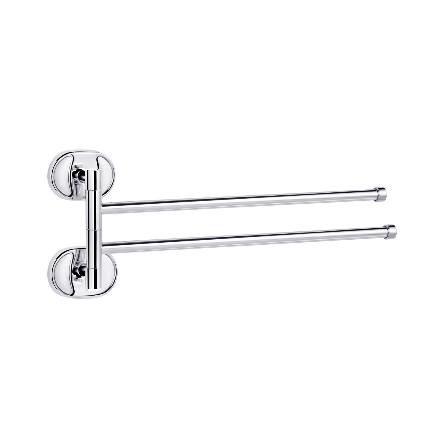 Держатель для полотенец изготовлен из прочного металла с хромированной поверхностью и имеет два поворотных стержня, на которые можно разместить два полотенца.