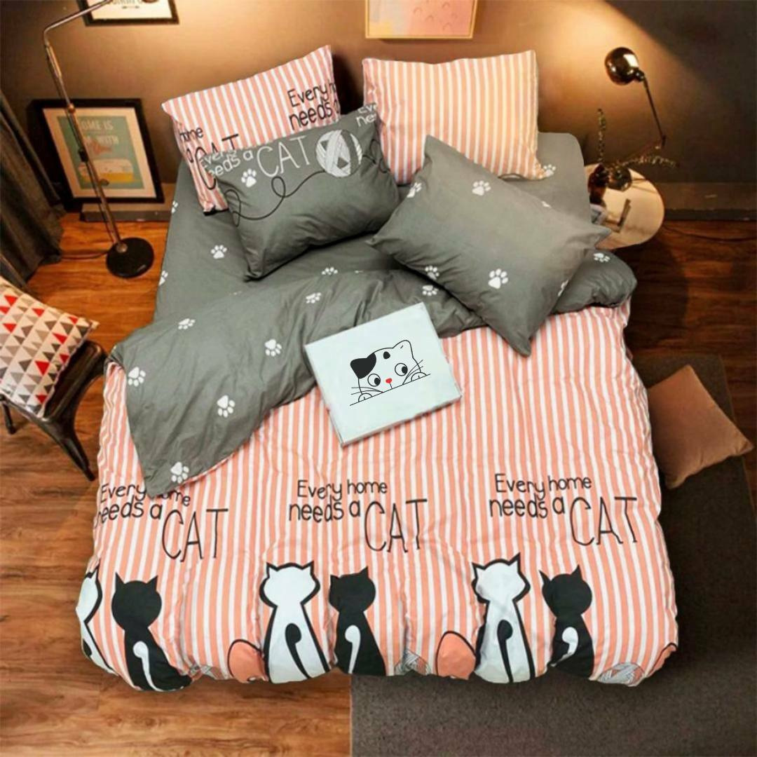 Постельное белье Кот Муркот Двухспальный Розовый в полоску с котиками и серый (VD_Рожева_пантера_Д)
