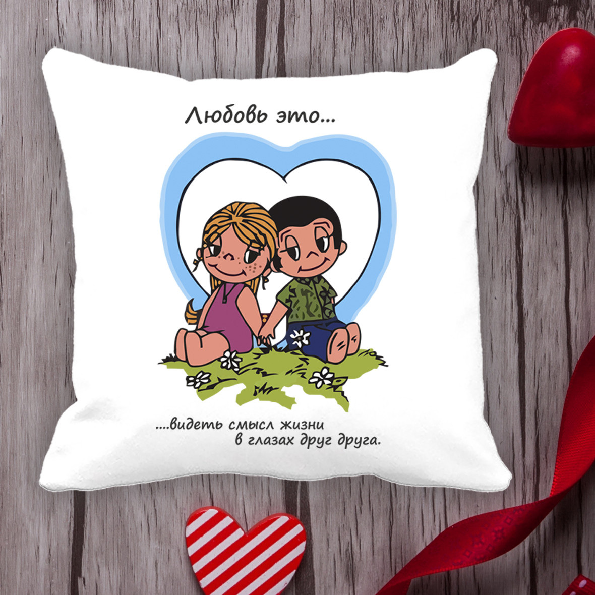 Описание Подушка с принтом Love is "Любовь это ... Видеть смысл жизни в глазах друг друга" Белый Кавун П000003