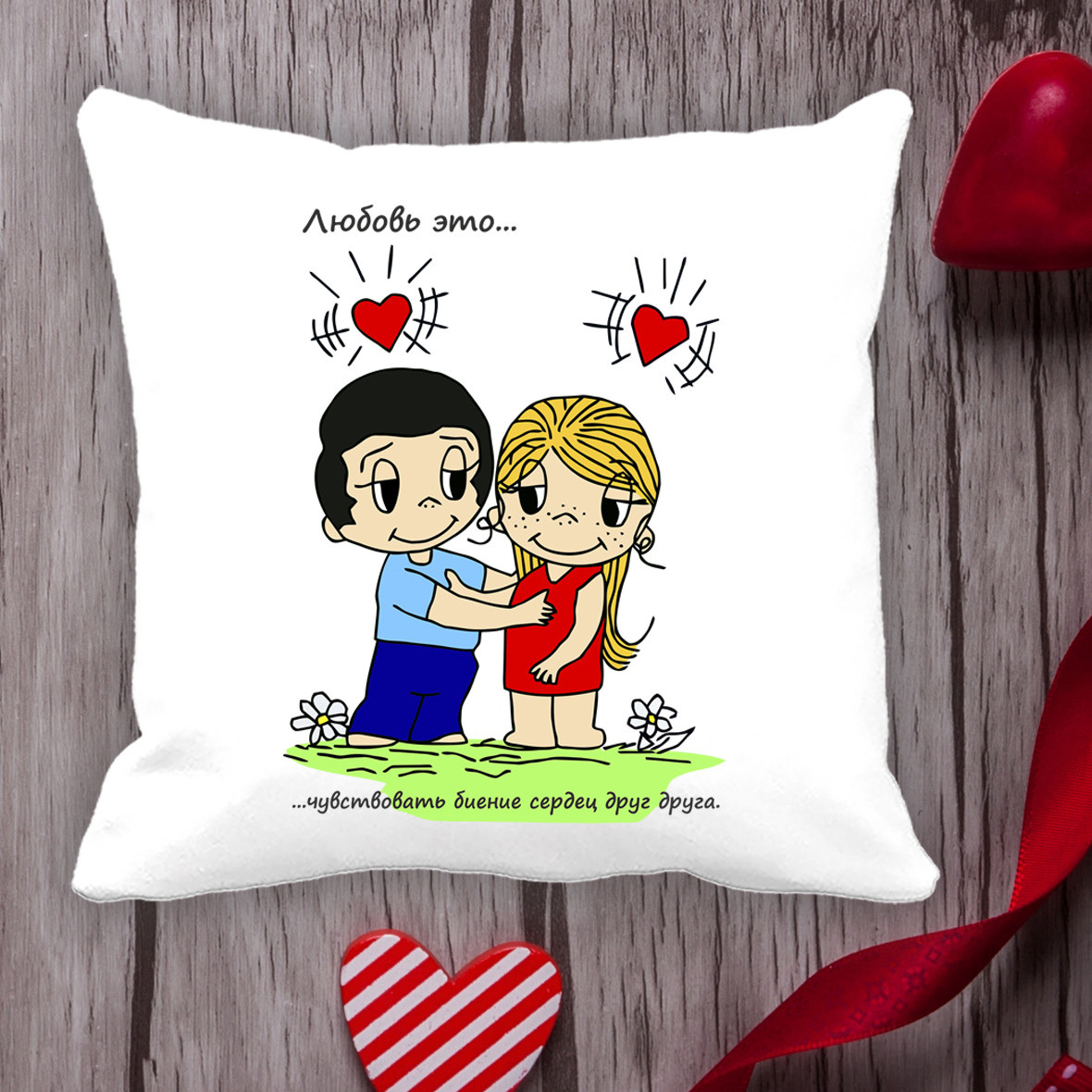 Описание Подушка с принтом Love is "Любовь это ... чувствовать биение сердец друг друга" Белый Кавун П000021