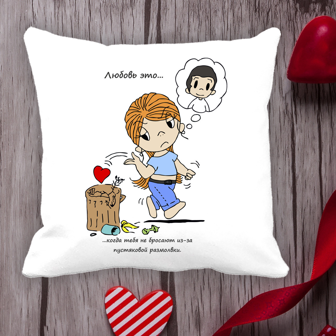 Описание Подушка с принтом Love is "Любовь это ... когда тебя не бросают из-за пустяков размолвки" Белый Кавун П000033