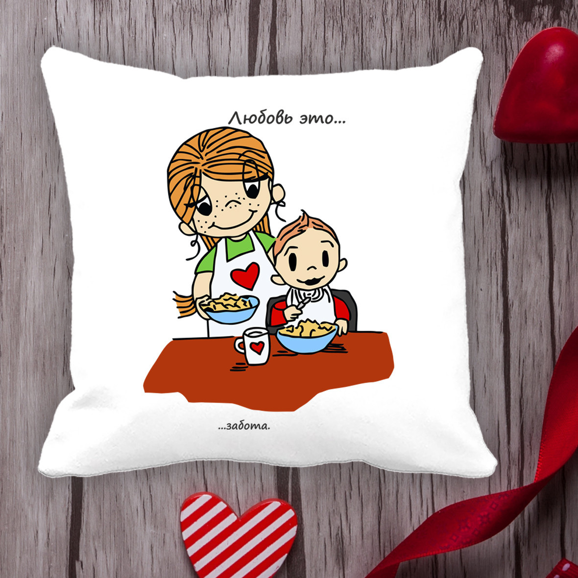Описание Подушка с принтом Love is "Любовь это ... забота" Белый Кавун П000046