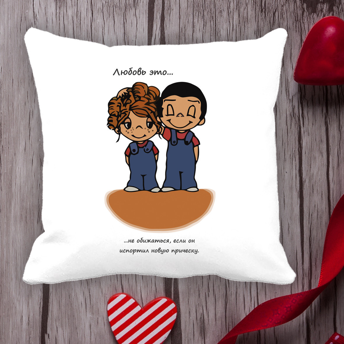 Описание Подушка с принтом Love is "Любовь это... не обижаться, если он испортил новую прическу" Белый Кавун П000089