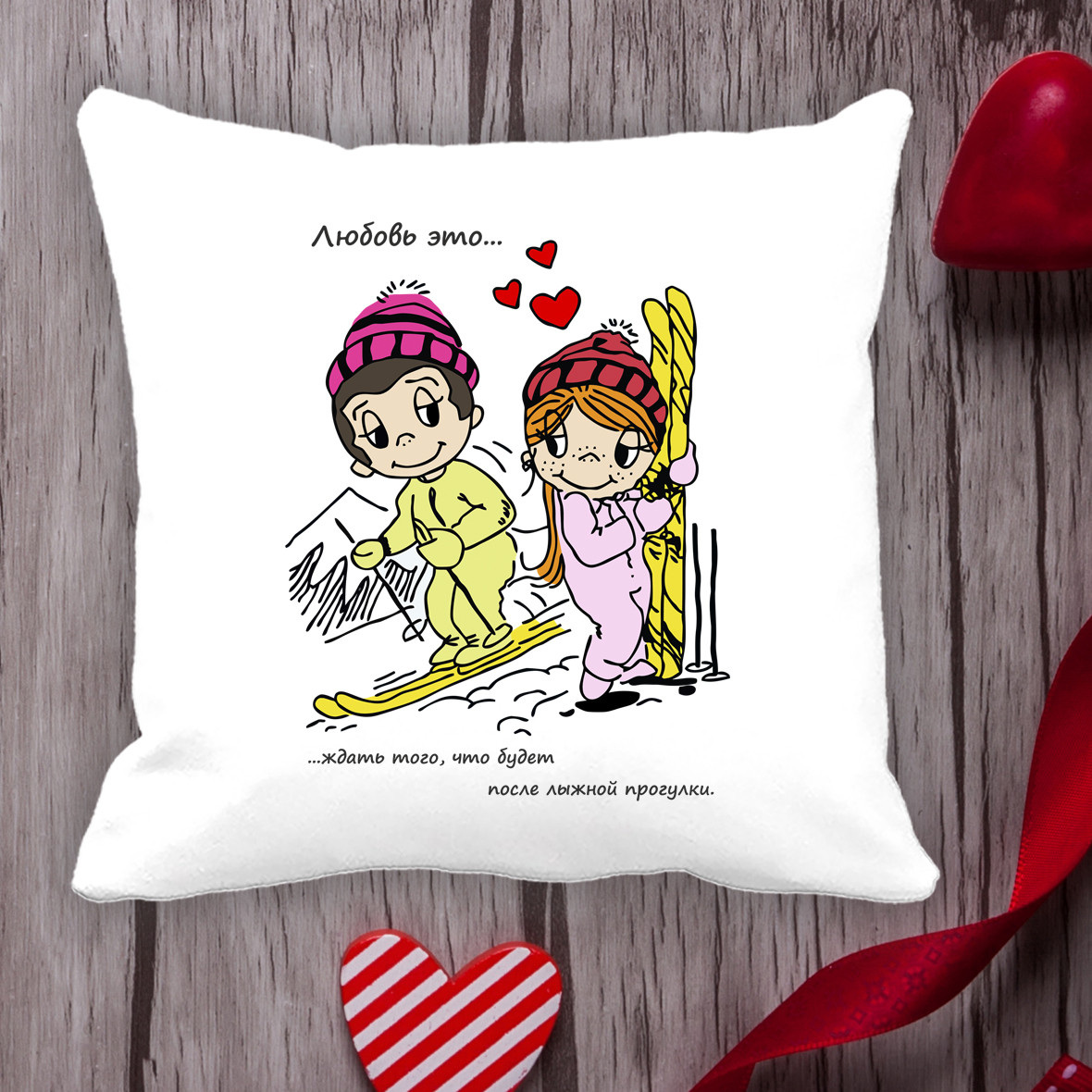 Описание Подушка с принтом Love is "Любовь это... ждать того, что будет после лыжной прогулки" Белый Кавун П000106