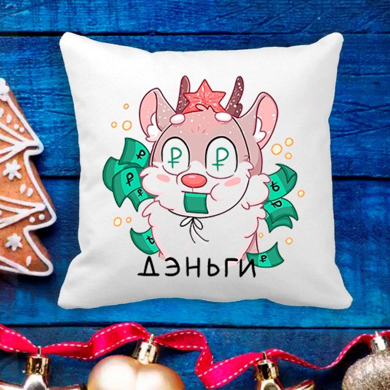 Подушка с новогодним принтом Олень "Дэньги" Белый Кавун П003634