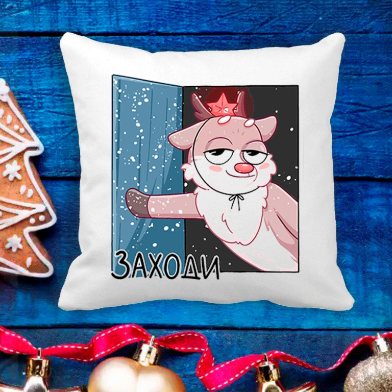 Описание Подушка с новогодним принтом Олененок "Заходи" Белый Кавун П003644