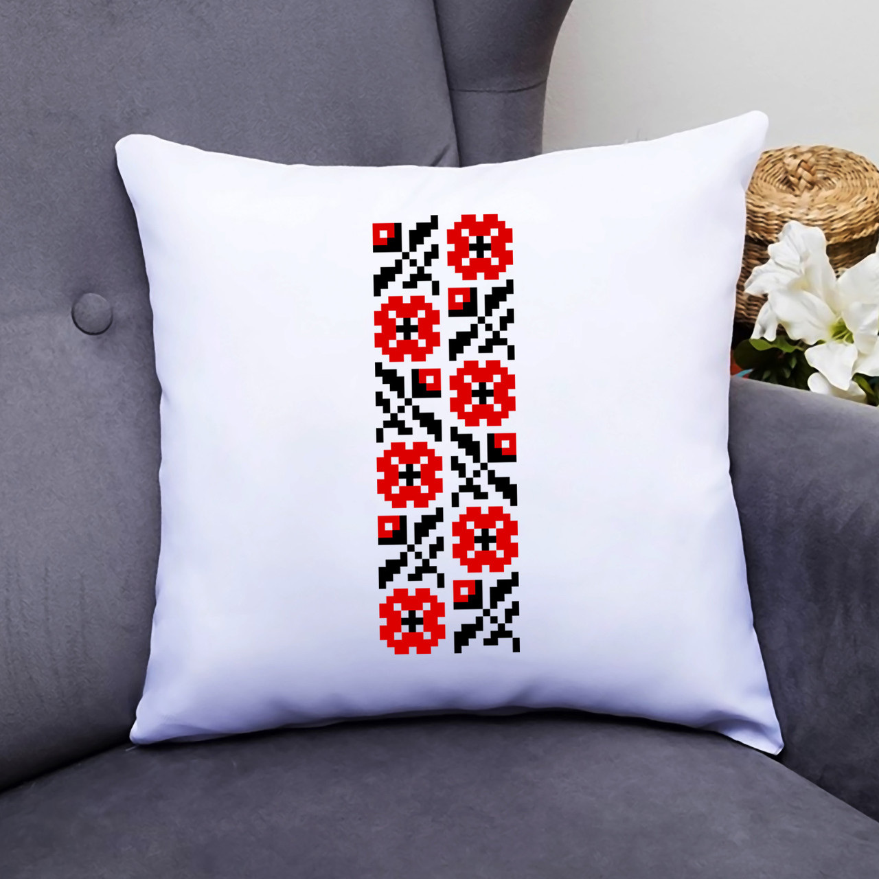Описание Подушка декоративная с принтом "Красный цветочный орнамент вышиванки на груди" Push IT Белый Кавун П000437