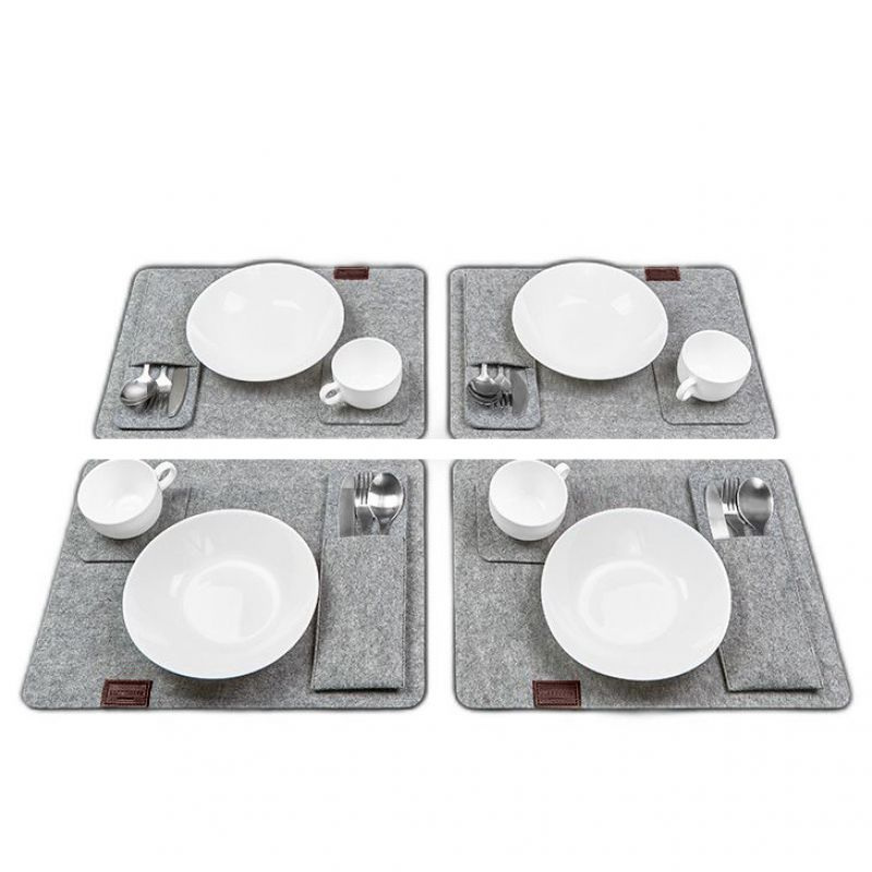 Фетровый набор для сервировки стола на 4 персоны Фетровый набор ручной работы для сервировки стола изготовлен из очень плотного и износостойкого эко-фетра. Такой набор будет вписываться в разные интерьеры и дизайны. Натуральный материал выгодно подчеркнет самобытность интерьера в этническом и скандинавском стиле. Лаконичный дизайн и серый цвет будут гармонично выглядеть в интерьерах в стиле лофт и хайтек. Фетр очень эффектно выглядит в сочетании с деревом, бетоном и разными металлическими поверхностями. Почему стоит купить набор для сервировки стола? Основная функция набора — защита поверхности стола от воздействия температур и механических повреждений. Набор помогает создать привлекательную и элегантную атмосферу, а также подчеркнуть особый характер события. Использование набора для сервировки упростит процесс уборки. Для чистки элементов набора используйте холодную воду и щадящие моющие средства. В комплект входит: 4 подставки под чашку 11х11 см; 4 чехла для приборов 9,5х27 см; 4 салфетки под тарелки 40х30 см; Такой набор подойдет и для домашнего пользования, и для сервировки столов в кафе и ресторанах. Наши мастера могут изготовить наборы по индивидуальному заказу в нужном дизайне и комплектации. Для корпоративных клиентов мы предлагаем специальные цены и возможность брендирования изделий.