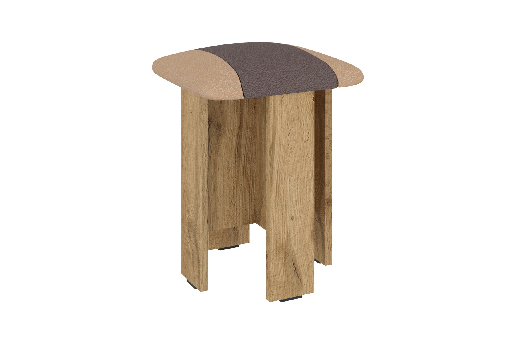 Даний табурет вирізняється своїм вишуканим оздобленням, у якому поєднуються теплі відтінки дерева з двоколірним сидінням з екошкіри. Ніжки виробу достатньо стійкі, міцно закріплені між собою по центру. Квадратне сидіння з закругленими кутами додає комфорту та естетичної привабливості. До того ж подібна форма робить табуретку зручною для щоденного використання.