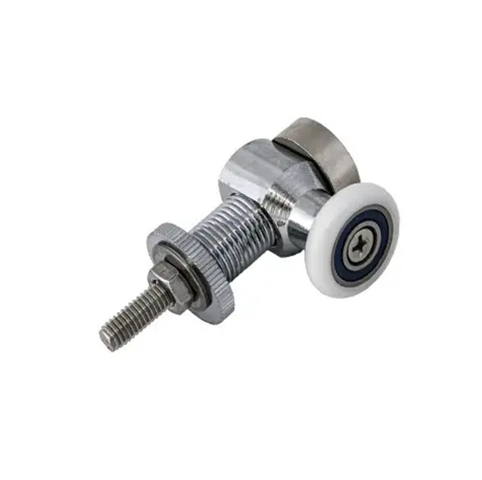 Ставится в верхней части стекла. Пружины спрятаны в корпусе ролика. Корпус пластиковый, колесико не поворотное, все металлические детали изготовлены из нержавеющих материалов. Диаметр болта составляет 6 мм. Вынос колесика 25 мм. Крепится в профиль душевой кабины.