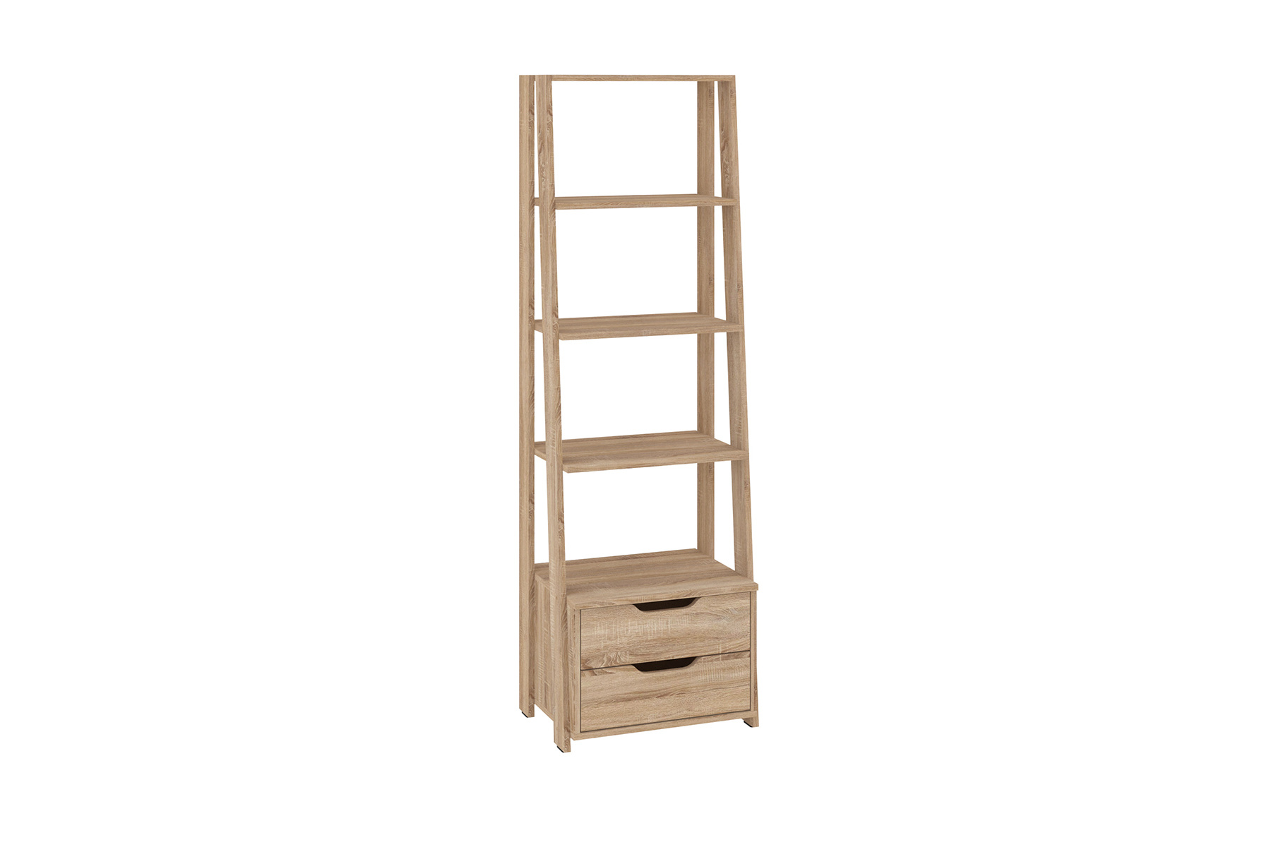 Стелаж оснащений чотирма відкритими полицями, які підходять для розміщення книг, декоративних предметів, рослин чи інших аксесуарів. Нижня частина стелажу містить дві висувні шухляди, які забезпечують додаткове місце для зберігання речей, що повинні залишатися поза увагою.