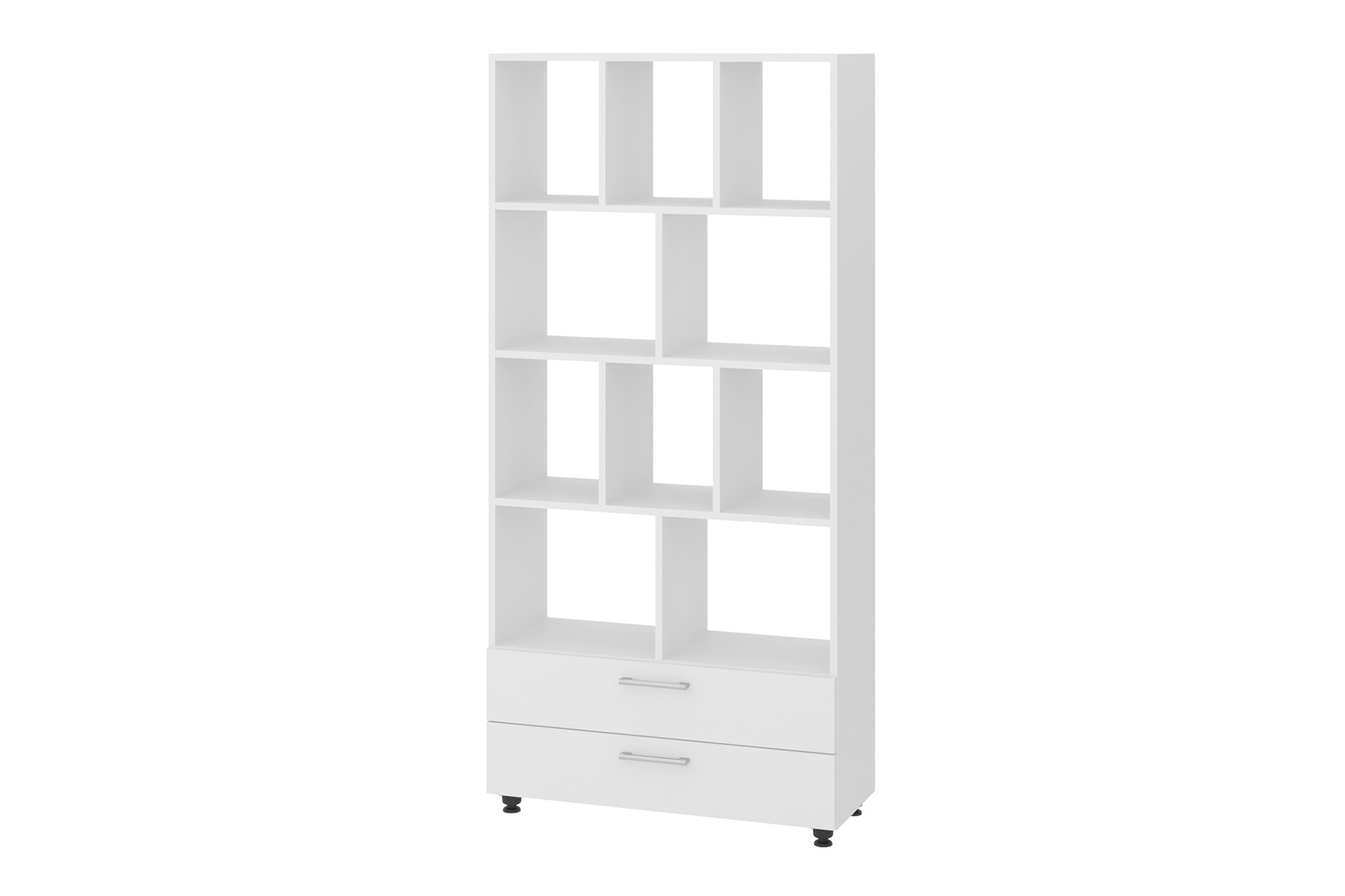Стелаж виконаний у строгому мінімалістичному стилі з прямими лініями. Він складається з кількох відкритих секцій, розташованих у чотири ряди, що створює чітку та впорядковану структуру.