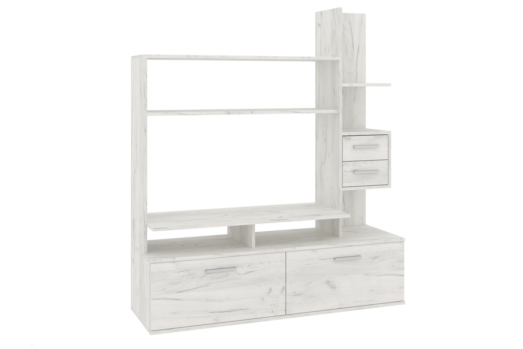 Нижня частина меблевого набору представлена широкою тумбою з двома великими закритими секціями. Ці секції підходять для зберігання більших речей, таких як техніка, книги або інші предмети, які потрібно приховати від очей для підтримки порядку у вітальні. Між верхніми полицями та тумбою знаходиться відкритий простір, який підходить для розміщення телевізора або інших мультимедійних пристроїв.