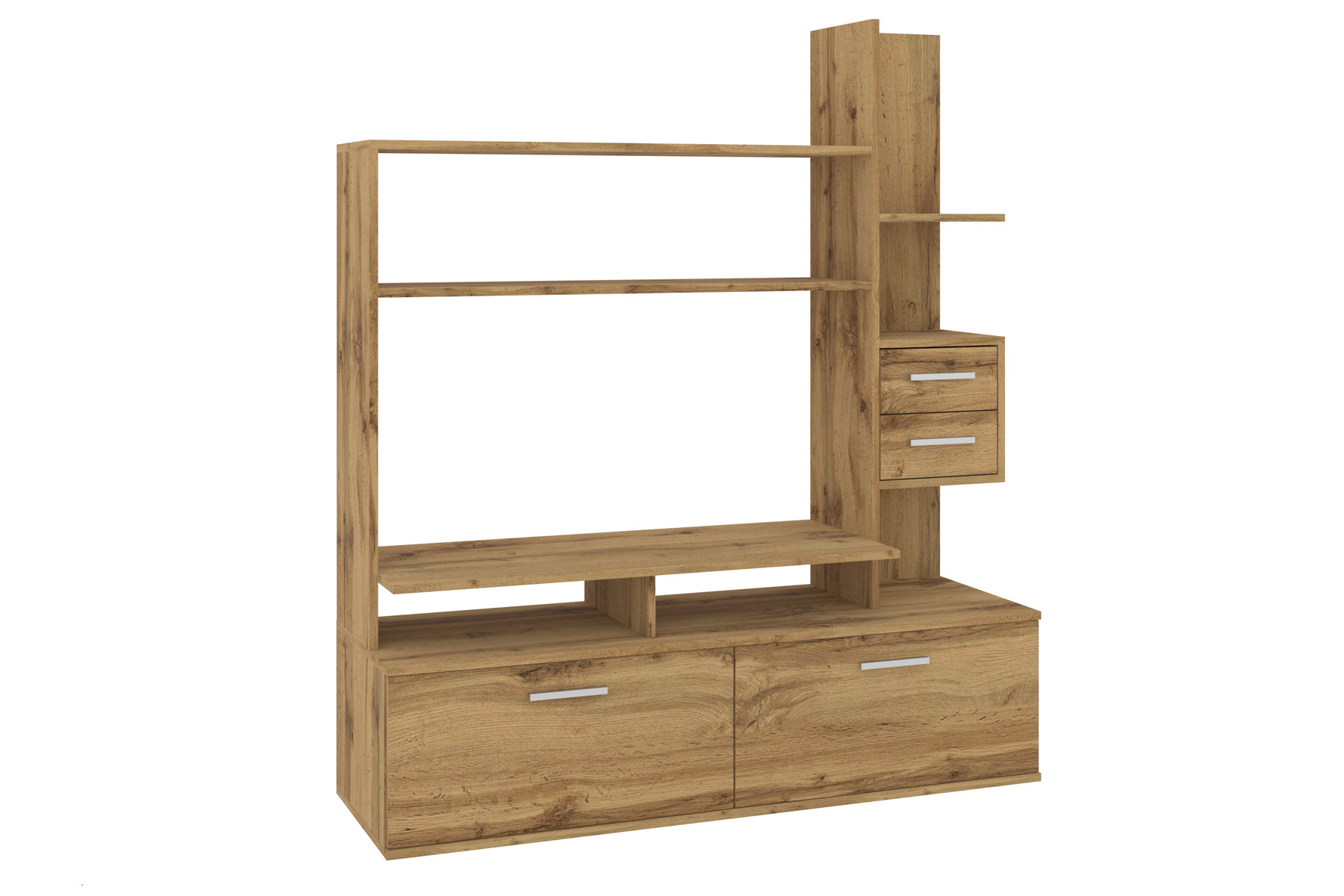 Нижня частина меблевого набору представлена широкою тумбою з двома великими закритими секціями. Ці секції підходять для зберігання більших речей, таких як техніка, книги або інші предмети, які потрібно приховати від очей для підтримки порядку у вітальні. Між верхніми полицями та тумбою знаходиться відкритий простір, який підходить для розміщення телевізора або інших мультимедійних пристроїв.