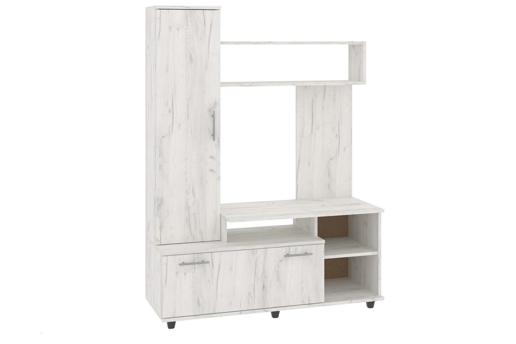 Ліва частина меблевого комплекту містить високу шафу з одними дверцятами для зберігання одягу, посуду або інших предметів. Верхня частина має відкриту поличку, яка може бути використана для розміщення декоративних предметів, книг чи електроніки.