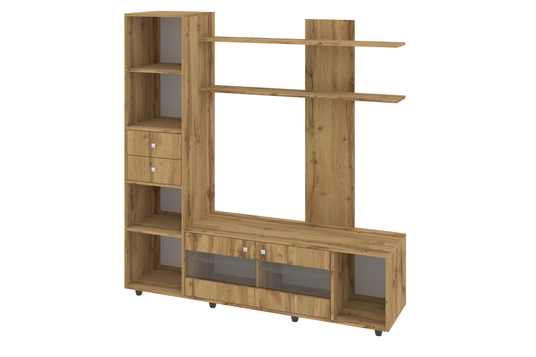 Нижня частина набору представлена широкою тумбою, яку зазвичай використовують для телевізора. Вона має декілька закритих секцій із дверцятами та відкриті полиці в центрі. На правій частині набору встановлені дві настінні полиці, які кріпляться до вертикальної панелі. Ці полиці створюють додатковий простір для розміщення декоративних предметів, сімейних фотографій або інших аксесуарів, надаючи вітальні більше глибини і легкості.