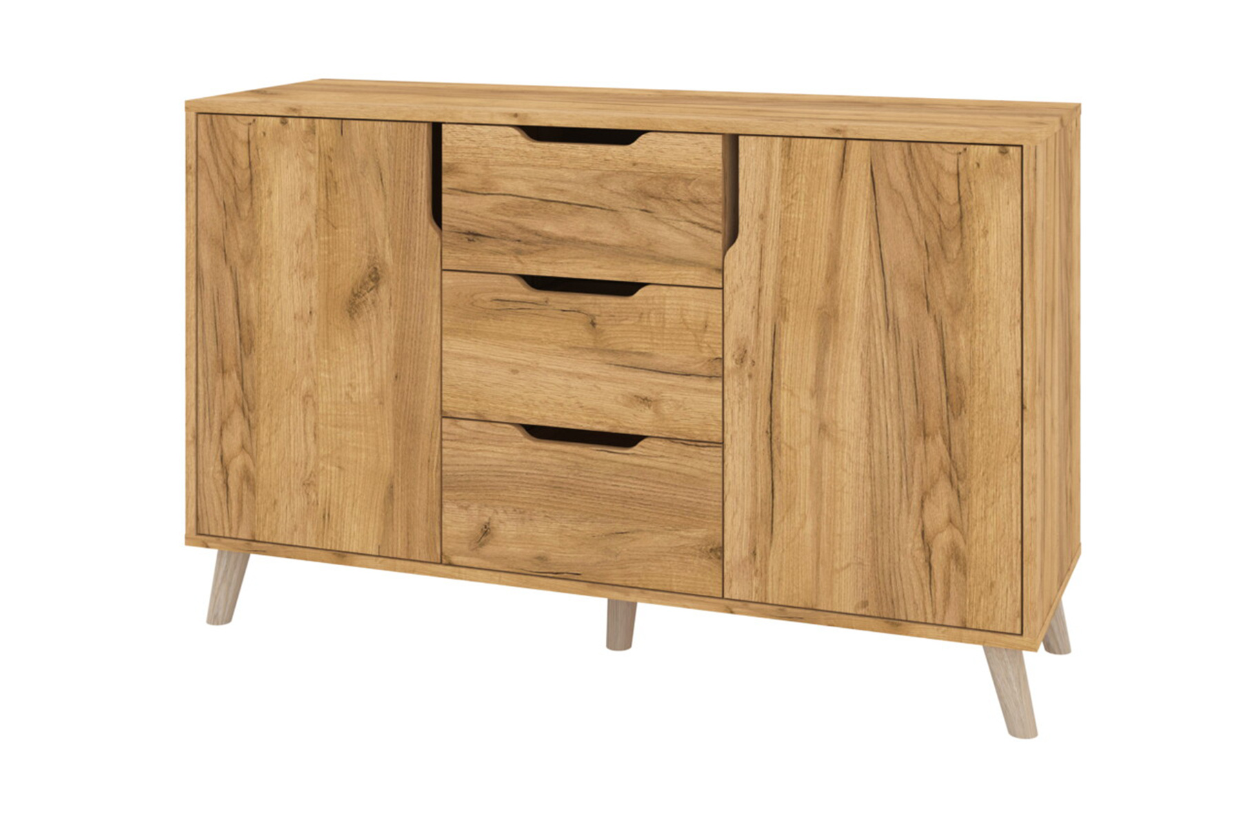 Три ящики та два відділення з дверцятами дозволяють організувати зберігання найрізноманітніших речей, забезпечуючи зручність і порядок у вашій вітальні чи спальні. Конструкція комоду достатньо стійка та чітко спланована, тому користуватися ним дуже зручно.
