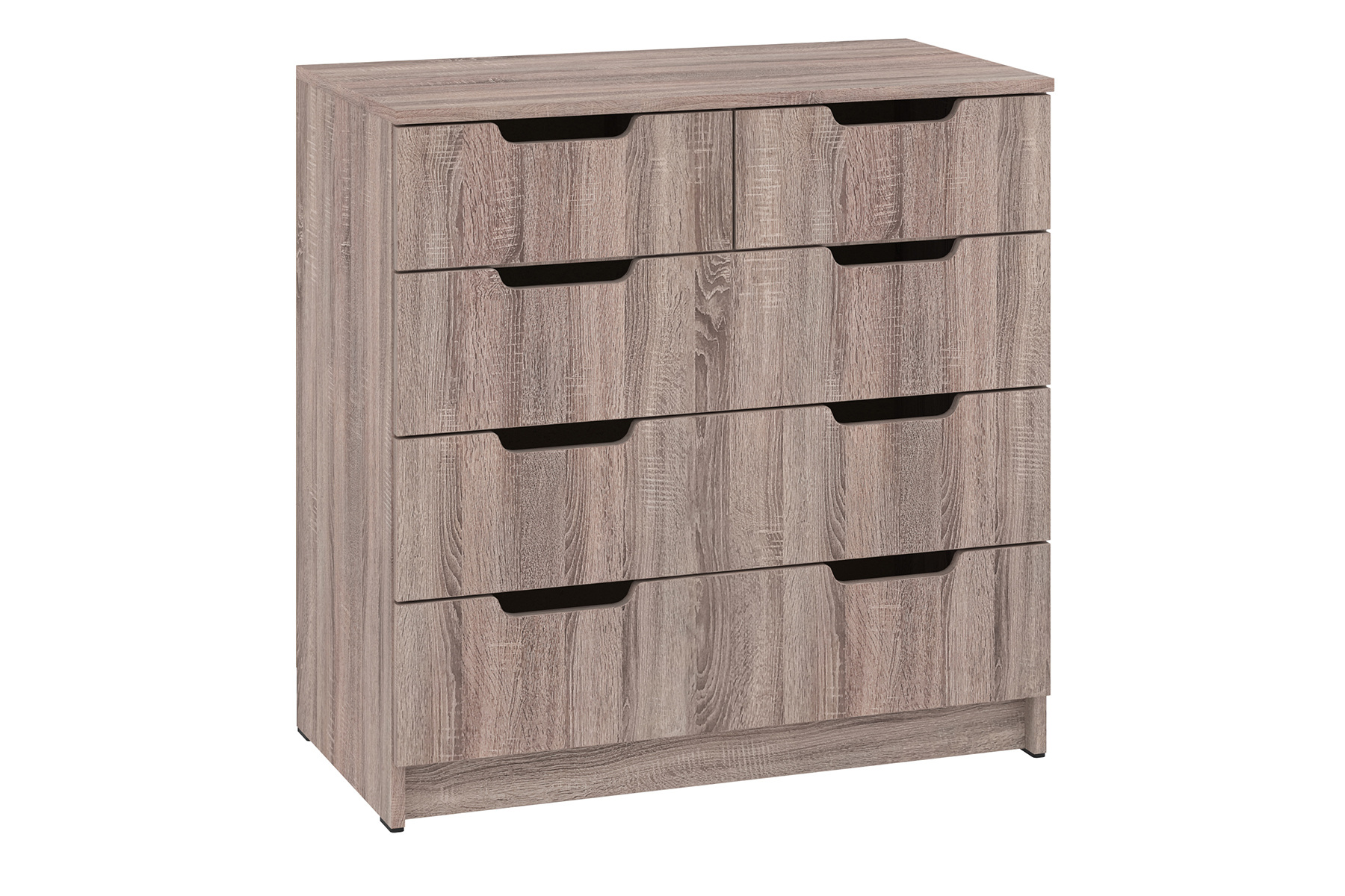 Комод складається з п'яти шухлядок різного розміру, що дозволяє зручно організувати простір для зберігання речей. Два верхні маленькі ящики ідеально підходять для зберігання натільної білизни, побутових дрібниць або аксесуарів. Нижні три великі ящики пропонують місце для більш габаритних предметів, таких як одяг, текстиль чи інші необхідні речі.