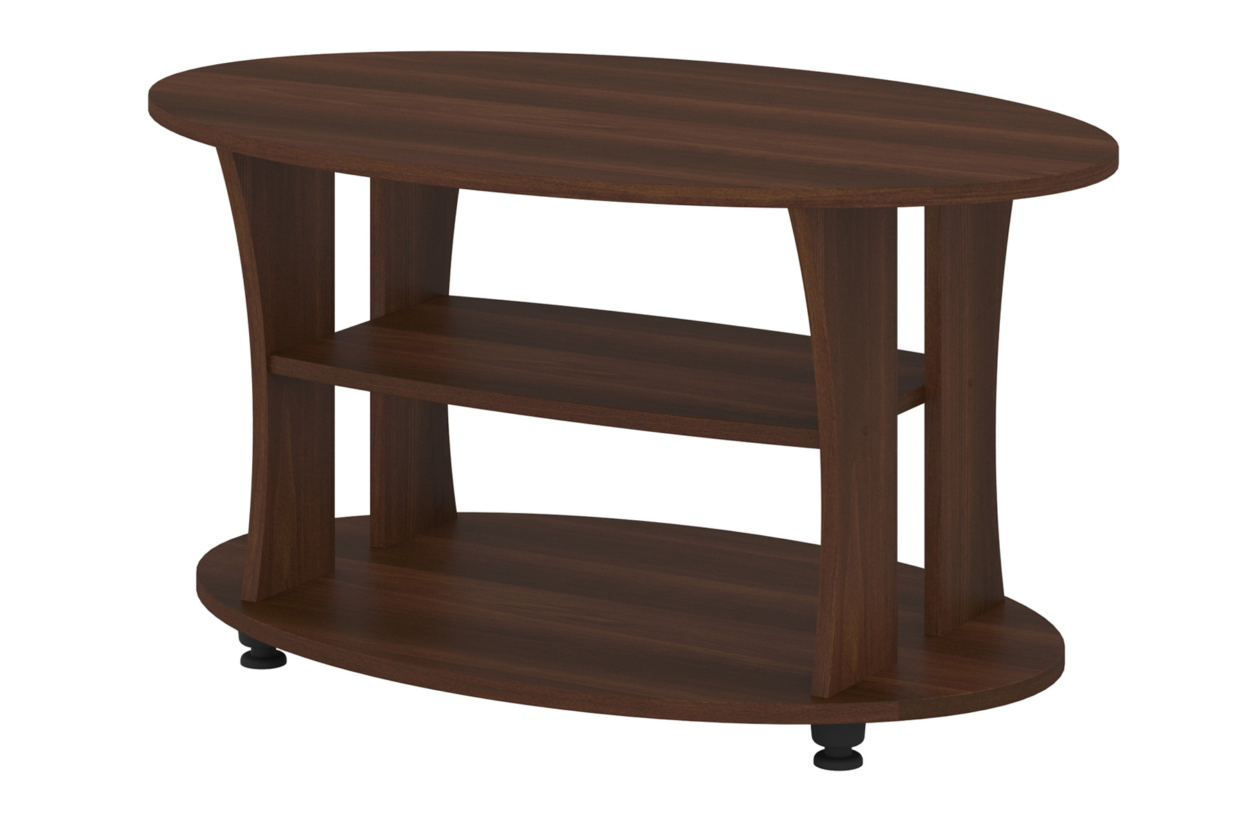 Дана модель представляє собою овальний столик з двома додатковими поличками під стільницею. Стіл має сучасний дизайн однотонного відтінку або з комбінованими кольорами. У другому варіанті: світла стільниця та полички контрастують з темними ніжками.