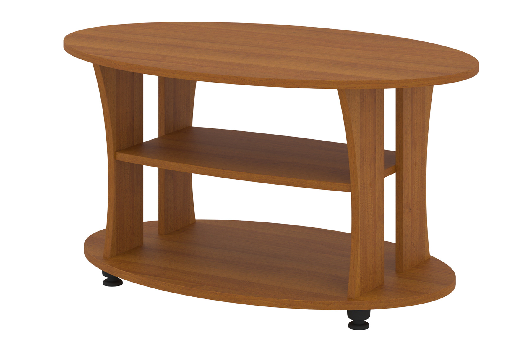 Дана модель представляє собою овальний столик з двома додатковими поличками під стільницею. Стіл має сучасний дизайн однотонного відтінку або з комбінованими кольорами. У другому варіанті: світла стільниця та полички контрастують з темними ніжками.