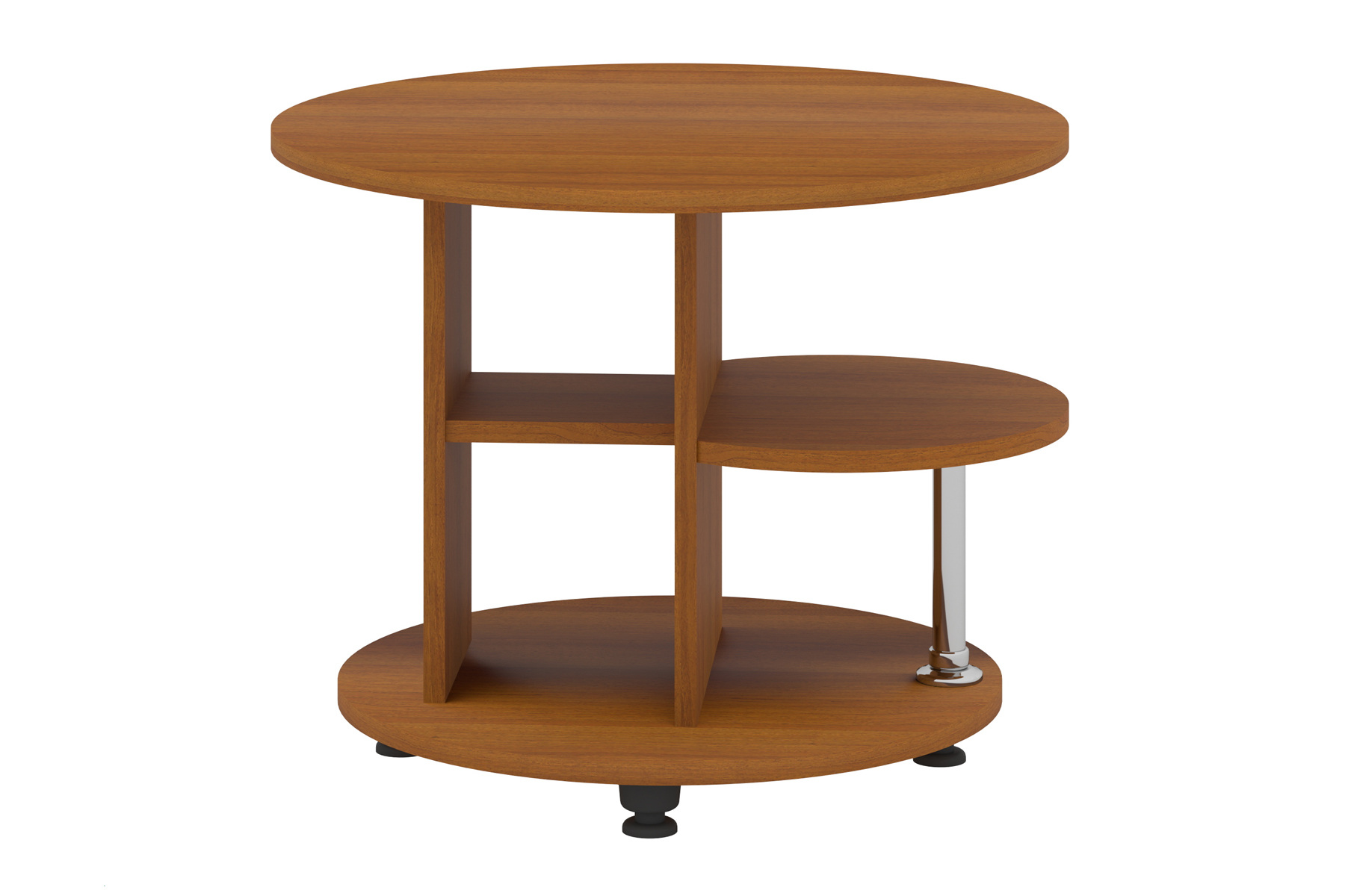 Дана модель кавового столику відрізняється оригінальним та трохи футуристичним дизайном, який гармонійно впишеться у сучасний інтер’єр. Основною особливістю столика є його кругла стільниця, яка плавно переходить у три яруси з полицями різної форми та розмірів. Столик має міцну конструкцію, що складається з центральної вертикальної опори і додаткової металевої ніжки, яка робить його достатньо стійким.