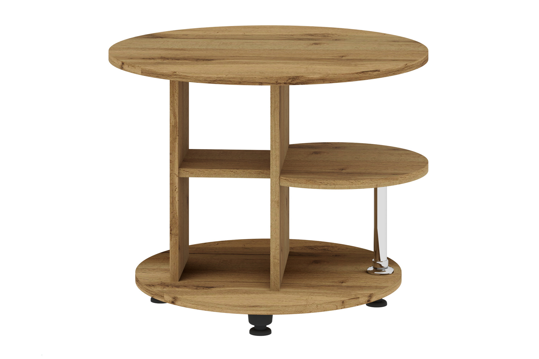 Дана модель кавового столику відрізняється оригінальним та трохи футуристичним дизайном, який гармонійно впишеться у сучасний інтер’єр. Основною особливістю столика є його кругла стільниця, яка плавно переходить у три яруси з полицями різної форми та розмірів. Столик має міцну конструкцію, що складається з центральної вертикальної опори і додаткової металевої ніжки, яка робить його достатньо стійким.