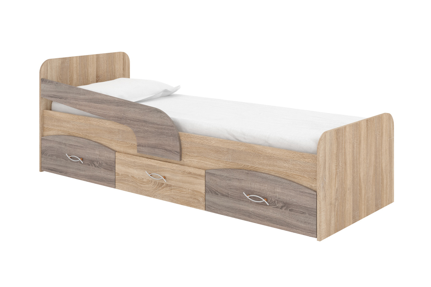 Зберігати речі та постільну білизну можна у трьох зручних шухлядках. Ця модель також має захисний бортик, що підвищує безпеку і комфорт для маленького користувача. Це рішення ідеально вписується в будь-яку дитячу кімнату.