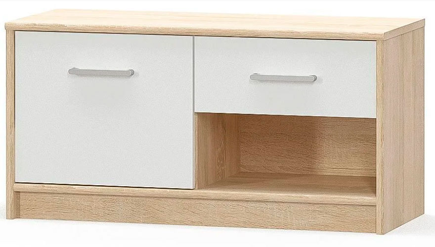 Тумба Типс - это элемент модульной системы Типс. Двухцветная тумба имеет один выдвижной ящик, одну открытую полку и одно отделение закрытое дверцей. Идеальное подходит для прихожей или дополнения к кровати из модульной системы предоставляя удобную поверхность для размещения ночных светильников и значительного количества пространства в ящиках.