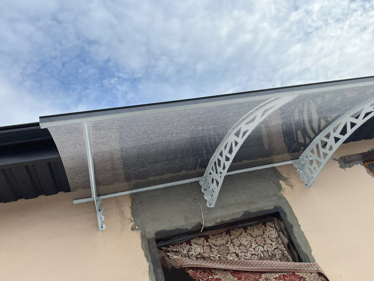 Готовый навес из поликарбоната над входом в здание Dash'Ok 2.05x1 м Хайтек - это современный и стильный способ защитить ваш вход от непогоды и создать эстетически привлекательный образ вашего дома.