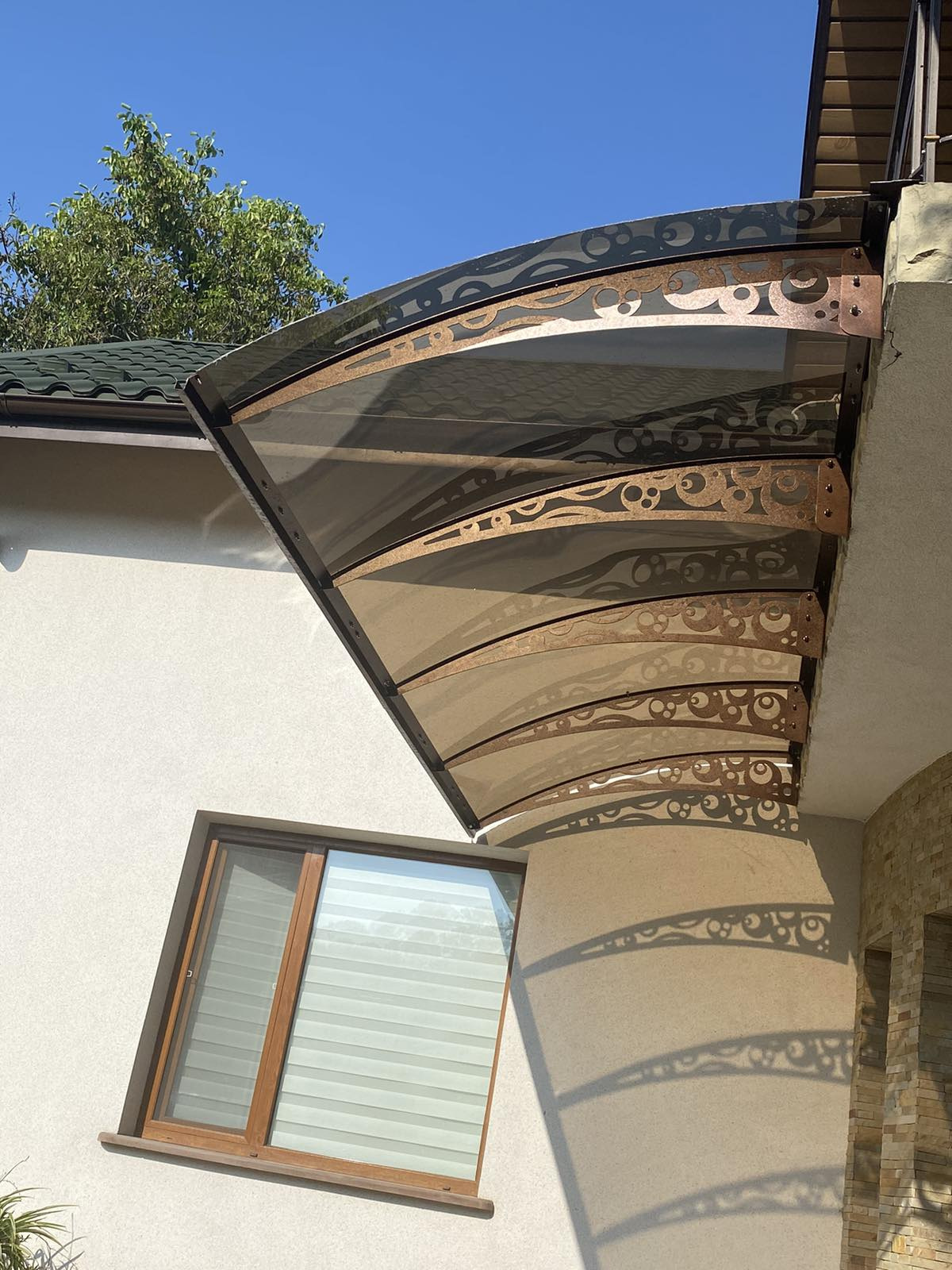 Описание Металический сборный навес (козырек) над дверью Dash`Ok 4,05x1.5 м Hi-tech, черный, мон 4 мм, бронза