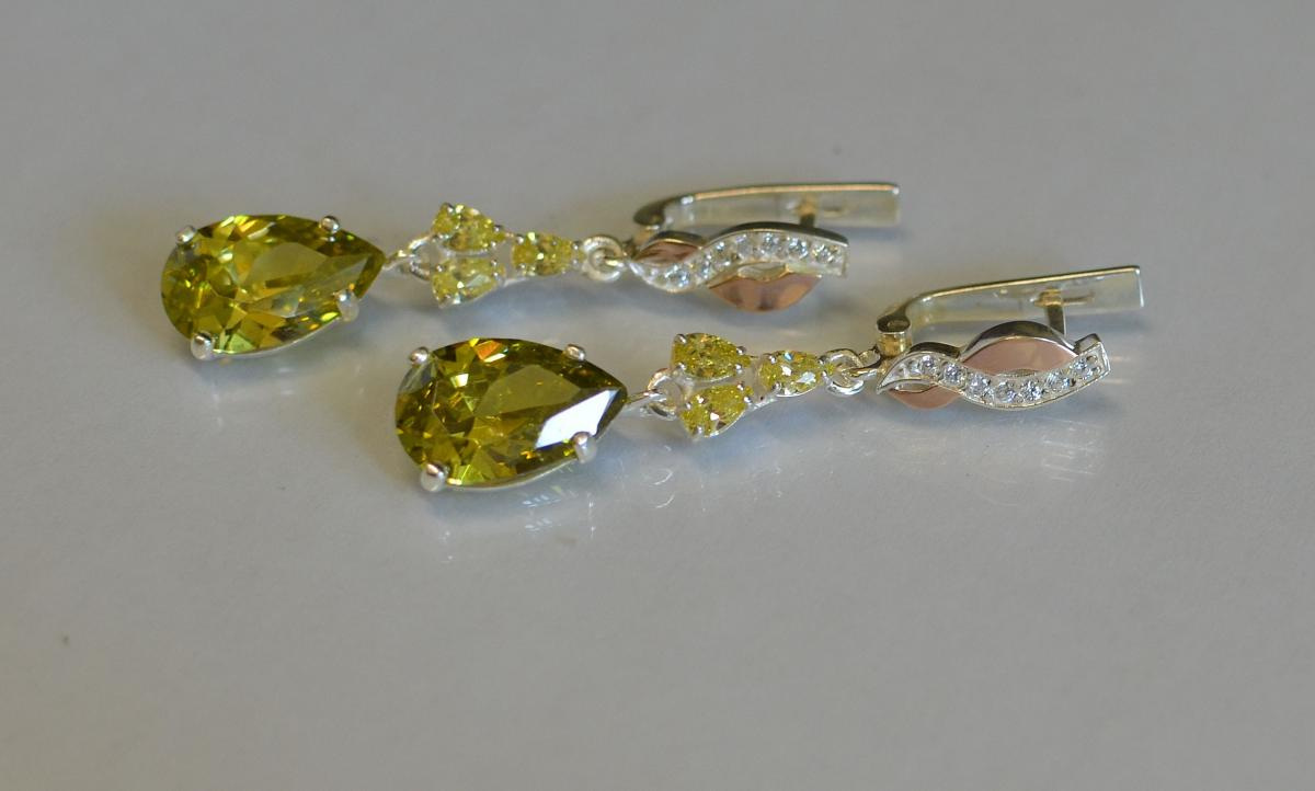 Серьги серебрянные Sil Myau с золотыми пластинами и фианитами 099s-6 Зеленый (Sil-678)