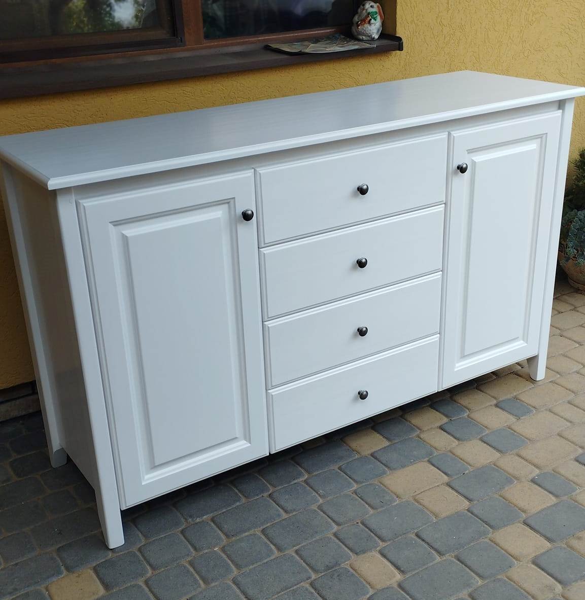 Этот комод отличается сдержанной эстетикой и безупречной геометрией форм. Его четыре аккуратных ящика, расположенные в центре, словно созданы для того, чтобы спрятать всё лишнее, оставляя ощущение чистоты и порядка. Боковые шкафчики с филёнками добавляют глубины и утончённости, ненавязчиво привлекая внимание к деталям. Круглые ручки с металлическим блеском вносят лёгкий штрих классической элегантности, гармонично дополняя общий образ.