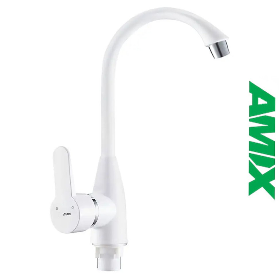 AMIX Mario-011 White - Компанія amix розробляє та виробляє широкий спектр недорогих та якісних кранів та змішувачів. Вартість моделі невисока, якщо порівнювати з аналогами. При цьому кран для умивальника прослужить довго. Змішувач умивальника комплектується аератором, що дозволяє заощаджувати воду. Модель виконана з термопластику, зручний важіль керування. Змішувач для раковини білий ремонтопридатний одноважільний - дрібні поломки можна усунути своїми руками. Кран має зовнішній тип монтажу, приєднується за допомогою гайки та гнучкої підводки, яка не йде разом із змішувачем.
